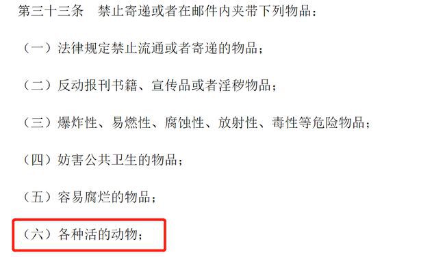 但是,根據(jù)《郵政法》相關(guān)規(guī)定,是明令禁止郵寄運輸活體動物。(除特殊運輸外,如具備相關(guān)證明的航運是允許運輸?shù)?。?/span>
